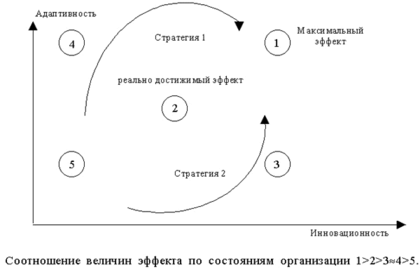 Итак, высокий уровень приспосабливаемости на базе освоения новшеств соответствует максимальной конкурентоспособности и обозначен на схеме областью 1.