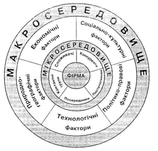 Маркетингове середовище — сукупність суб'єктів, умов та сил, що діють за межами фірми і здатні вплинути на її маркетингову діяльність. Фактори зовнішнього середовища поділяють на дві групи: мікросередовище і макросередовище (рис. 1). Мікросередовище становлять: