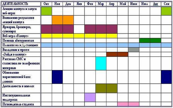 Общая схема мероприятий по маркетингу представлена в табл.1. Несмотря на то, что в таблице мероприятия даны с октября (начало учебного года), будет логичнее рассматривать маркетинговый годовой цикл с января.