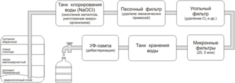 Несмотря на то, что вода из артезианской скважины глубиной более 300 метров, как правило, уже пригодна к употреблению, при прохождении по металлическим трубам она может засориться частицами ржавчины и другими включениями. Поэтому, в любом цехе по розливу питьевой воды установлена целая линия по подготовке, очистке и обеззараживанию.