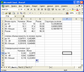 1) Для аналізу структури населення за віком розрахуємо відносну частку кожної вікової групи у загальній чисельності населення (діленням чисельності відповідної вікової групи на загальну чисельність населення). Розрахунок виконується за допомогою табличного процесора MSExcel: