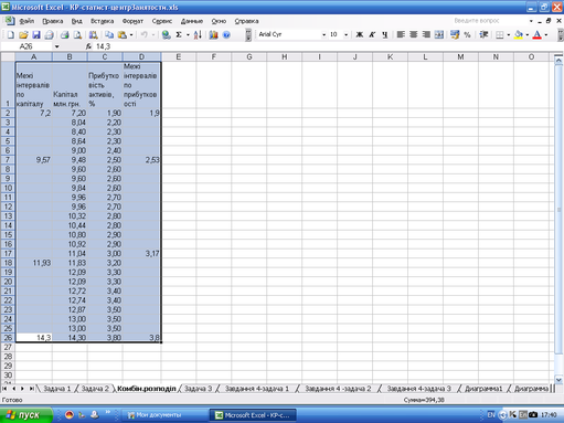 | Межі інтервалів по капіталу | Капітал млн.грн. | Прибутковість активів, % | Межі інтервалів по прибутковості |
