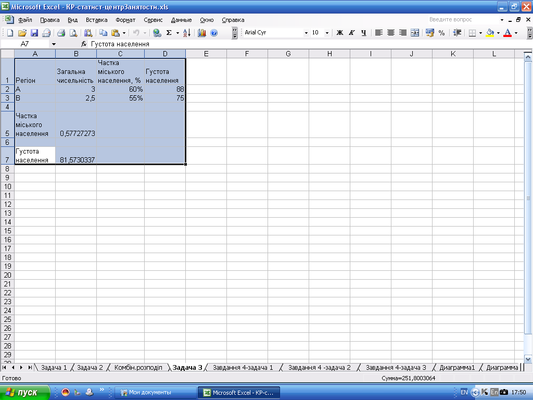 Для розрахунку частки міського населення застосовуємо середнє арифметичне зважене, оскільки відоме значення величини, що осереднюється, і абсолютні значення чисельності населення та міського населення по регіонах. Вагою додатків є відносна частка населення регіону у загальній чисельності населення.
