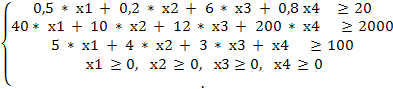 40* х1 + 10 * х2 + 12 * х3 + 200 * х4 ≥ 2000. (2)