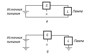 Рис. 3 - Лампа, управляемая выключателем: а – простое соединение с батареей; б – использование заземления, как обратной связи