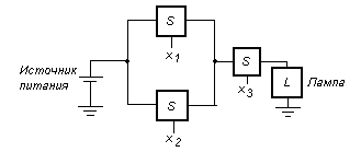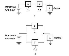 Рассмотрим теперь возможность использования двух выключателей для управления состоянием лампы. Пусть х1 и х2 – управляющие переменные (входы) для этих выключателей. Выключатели могут быть соединены последовательно или параллельно, как показано на рис. 4: