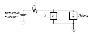 Пусть лампа подсоединяется к источнику питания так, как показано на рис. 6: