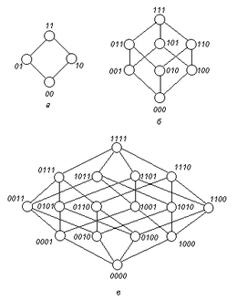На рис. 7 показаны п-мерные кубы для булевых функций: двух переменных (а), трех переменных (б), четырех переменных (в).