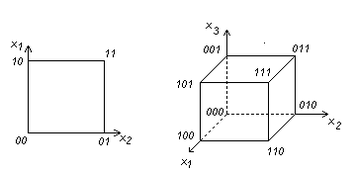 Данный метод устраняет недостаток предыдущего метода, т.е. устраняет необходимость попарного сравнения всех термов на первом этапе при нахождении простых импликант. Для этого строится п-мерный куб, по которому визуально можно определить те конъюнктивные термы, склеивание которых порождают простые импликанты.