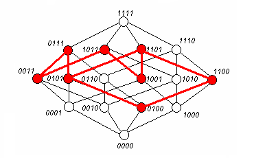 Построим единичный 4 – мерный куб и выделим вершины, соответствующие двоичным наборам, входящим в заданную булеву функцию (рис. 10):