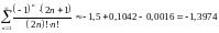 Для приближённого вычисления ряда достаточно первых трех членов ряда (по следствию признака Лейбница: сумма сходящегося знакопеременного числового ряда не превышает его первого члена). Следовательно, ошибка при вычислении не превысит 0,0000093, а, значит, и