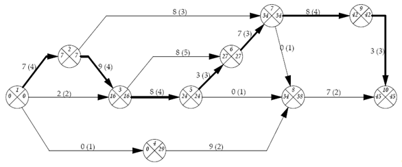 Данную сетевую модель можно оптимизировать. Для этого на критические пути увеличиваем количество рабочих, снимая их с менее загруженных участков. Таким образом, сокращаются сроки выполнения работ.