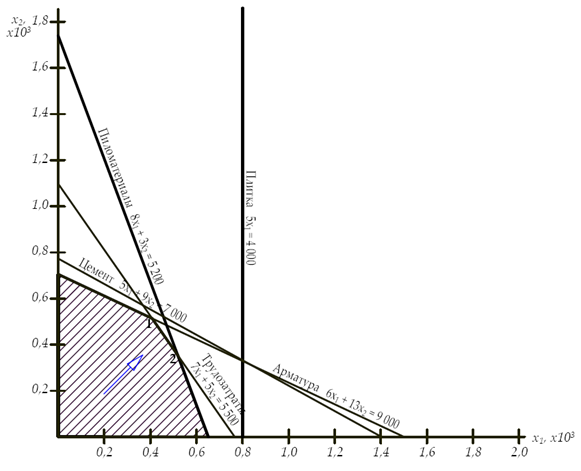 Возрастание целевой функции направлено слева вверх под углом 45°, и последней точкой в допустимой области будет точка 1 или 2.