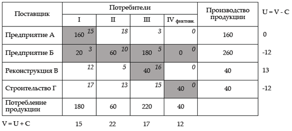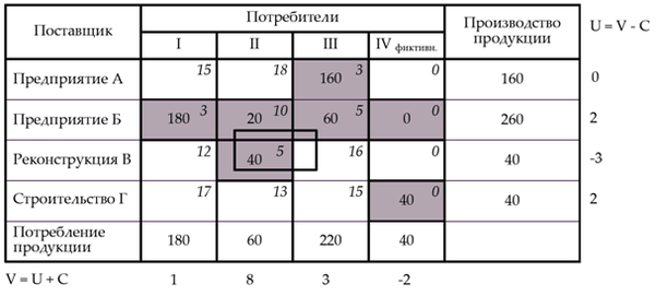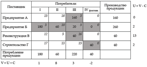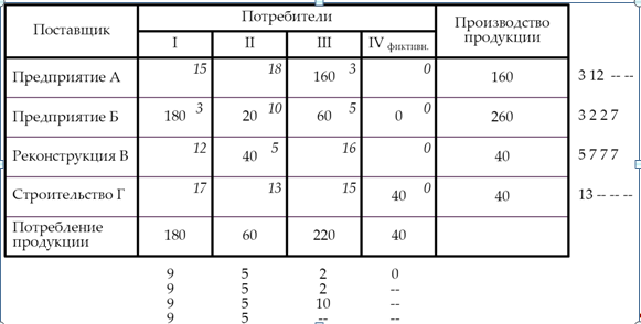 Следовательно, матрица – вырожденная, поэтому в одну из свободных ячеек в зоне вырождения вводим условную нулевую поставку груза.
