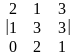 C11 = 2 x (-1) + (1 x 0) + 3 x 2 = -2 +6 = 4