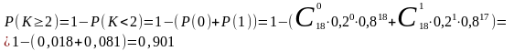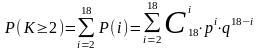 Ймовірність настання події А у кожному з 18 незалежних випробуваннях дорівнює 0,2. Знайти ймовірність настання цієї події принаймні двічі.