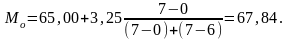 З таблиці 2.1 найбільше число реалізацій величини з інтервалу 65,00 - 68,25. Це модальний інтервал, ширина якого h=3,25, нижня межа xo=65,00, частота fmo=7, передмодальна частота fmo-1=0, післямодальна частота fmo+1=6. Маємо: