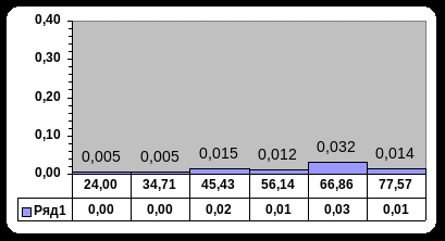4) Х – дискретная случайная величина. Найдем функцию распределения F(x)=P{x 25. Три плавбазы вышли на путину. Вероятность того, что первая из них перевыполнит план равна 0,9; вторая – 0,8 и третья – 0,85. СВ Х – число баз, перевыполнивших план. Случай ная величина Х может принимать такие значения Х=0 если ни первая ни вторая ни третья базы не перевыполнили план Х=1 – это может произойти если 1-я база перевыполнила план, а вторая и третья нет, или вторая перевыполнила а первая и третья нет, или третья первыполнила а первая и вторая нет. Х=2 –если первая и вторая базы перевыполнили план а третья нет, или вторая и третья перевыполнили а первая нет, или первая и третья перевыполнили а вторая нет. Х=3- если все три базы перевыполнили план . Найдем их вероятности. П 1)Запишем ряд распределения Х Х 0 1 2 3 Р 0,003 0,056 0,329 0,612 2) См. рисунок 1(25) 3 Дисперсия С 4) Х – дискретная случайная величина. Найдем функцию распределения F(x)=P{x 31-40. Случайная величина Х задана плотностью распределения (х). Определить: а) параметр А; б) функцию распределения вероятностей (х); в) математическое ожидание МХ; г) дисперсию ДХ; д) вероятность того, что в n независимых испытаниях случайная величина Х попадет ровно m раз в интервал (, ). Построить графики функций (х), (х). 31. (х)= n = 4, m = 3, = 0, = 2 а)Для плотности распределения непрерывной случайной величины должно выполняться условие В нашем случае б) Функция распределения вероятностей в) Математическое ожидание г) Дисперсия д) При каждом независимом испытании вероятность попадания в интервал равна П е)Графики смотри рис.2(31) 35. (х)= n=4, m=2, =-1/3 А, =5/4 А. а)Для плотности распределения непрерывной случайной величины должно выполняться условие В нашем случае б) Функция распределения вероятностей в) Математическое ожидание г) Дисперсия д) При каждом независимом испытании вероятность попадания в интервал равна П е)Графики смотри рис.2(35) 41-50. Дана выборка значений признака Х. Требуется: построить статическую совокупность; построить гистограмму частот; найти точечные оценки генеральной средней, генеральной дисперсии и генерального среднего квадратического отклонения; найти доверительный интервал для неизвестного математического ожидания; проверить нулевую гипотезу о нормальном законе распределения количественного признака Х генеральной совокупности. 41. 38, 51, 57, 64, 76, 92, 89, 19, 35, 60, 22, 41, 44, 48, 60, 44, 67, 80, 86, 57, 25, 83, 73, 70, 70, 70, 64, 60, 60, 64, 57, 54, 57, 54, 32, 86, 86, 80, 76, 60, 76, 70, 70, 67, 67, 64, 64, 60, 28, 67, 41, 41, 51, 48, 44, 80, 80, 76, 73, 51, 67, 60, 32, 41, 41, 54, 57, 60, 67, 73, 73, 76, 57, 67, 73, 73, 64, 60, 54, 57. Объем выборки n=80 Наименьшее значение признака Х MIN: 19 Наибольшее значение MAX: 92 Определим оптимальное число интервалов разбиения по формуле Число интервалов: 7,00 Шаг интервала h=(92-19)/7= 10,43 Составим интервальный вариационный ряд И Колич. Элементов m(i) Относит. Частоты m(i)/n Середины интервалов 19,00 29,43 4 0,05 24,21 29,43 39,86 4 0,05 34,64 39,86 50,29 10 0,13 45,07 50,29 60,71 23 0,29 55,50 60,71 71,14 18 0,23 65,93 71,14 81,57 15 0,19 76,36 81,57 92,00 6 0,08 86,79 2 3)Точечной оценкой математического ожидания является эмпирическая средняя Точечной оценкой генеральной дисперсии является дисперсия эмпирическая Точечная оценка генерального среднего квадратического отклонения Исправленное среднее квадратическое отклонение 4)Доверительный интервал для неизвестного математического ожидания имеет вид (при надежности p=0.95) Доверительный интервал для оценки математического ожидания имеет вид Г По таблицам значений ф