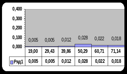 )Построим гистограмму частот, откладывая по оси Х границы интервалов а по оси У значения