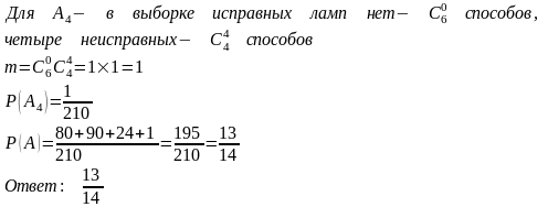 Из 10 радиоламп 4 неисправны. Случайно взяты 4 лампы. Найти вероятность того, что среди них окажется хотя бы одна неисправная