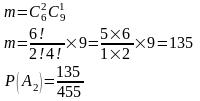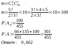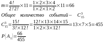 Из урны, содержащей 4 белых, 6 красных и 5 черных шаров случайно извлекли 3 шара. Найти вероятность того, что два из них одного цвета