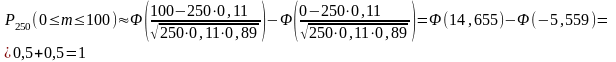 г) Вероятность того, что из 250 изделий цеха окажется бракованными не более 100 изделий, найдем, используя интегральную теорему Лапласа: