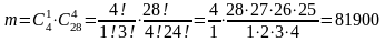 Благоприятное исход состоит в том, что вынут 1 туз из 4-х возможных и 4 другие карты из оставшихся 28, таким образом, число благоприятных способов равно: