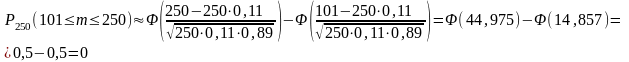 в) Вероятность того, что из 250 изделий цеха окажется бракованными не менее 101 изделий, найдем, используя интегральную теорему Лапласа: