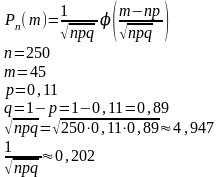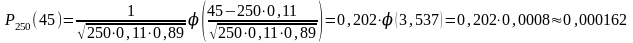 а) Вероятность того, что из 250 изделий цеха окажется бракованными ровно 45 изделий, найдем, используя локальную теорему Лапласа: