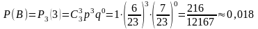 б) Событие В – все три вынутые с возращением в коробку карандаши синие, то есть три раза будут выниматься 1 синий шар из 23.