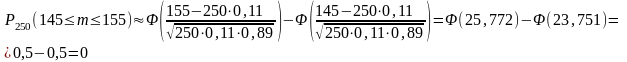 б) Вероятность того, что из 250 изделий цеха окажется бракованными от 145 до 155 изделий, найдем, используя интегральную теорему Лапласа: