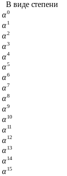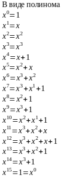 И так далее, пока не будет получено 24= 16 элементов. Ниже представлено представление поля GF(24), полученного способом, изложенным выше.