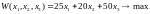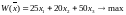 Хотим найти такой ассортимент выпускаемых товаров, при котором прибыль будет максимальна Прибыль от продаж 1 единицы каждого изделия 25, 20 и 50$ Записываем функцию цели:
