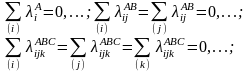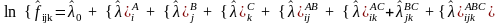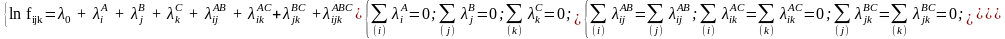 де ln(nijk) – очікувана частота чарунка (і, j, k) тривимірної таблиці спряженості, обчислена за умови незалежності змінних A, B, C; параметри λ визначають внесок у логарифм очікуваної частоти змінних як окремо , так і внаслідок їхньої взаємодії. Параметри λ логлінійної моделі задовольняють умовам: