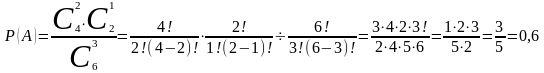 Имеется 6 билетов в театр, 4 из которых на места первого ряда. Какова вероятность того, что из 3 наудачу выбранных билета 2 окажутся на места первого ряда?