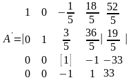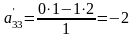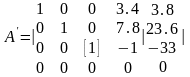 В полученной матрице в качестве разрешающего элемента берем не равный нулю элемент из любой строки, кроме первой и второй, например а33=1. Делим элементы разрешающей второй строки на «1». Все элементы первого и второго столбца, кроме а11=1 и а22=1 берем равные «0», а остальные элементы находим по правилу прямоугольника: