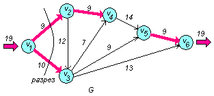 Других маршрутов нет (другие маршруты проходят через насыщенные дуги). Поток максимален. Делаем разрез вокруг вершины v1 по насыщенным дугам