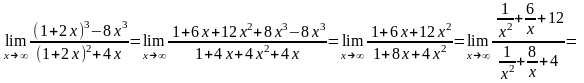 - неопределенность с бесконечностью. Раскроем скобки, приведем подобные и разделим числитель и знаменатель дроби на максимальную степень х. Получим: