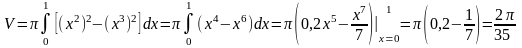 Объем тела, полученного вращением плоской фигуры около оси ОХ найдем по формуле: