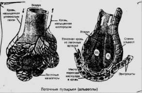 Каждое легкое специальными плевральными бороздами делится на доли: левое на две (верхнюю и нижнюю), правое на три (верхнюю, среднюю и нижнюю). Доли легкого состоят из сегментов (по 10 сегментов в каждом легком). При воспалительном поражении того или иного сегмента говорят о сегментарной пневмонии. Сегменты, в свою очередь, состоят из долек, в которые входят конечные разветвления бронхиального дерева (их диаметр всего 1 мм). Конечные разветвления переходят в дыхательные бронхиолы, которые образуют альвеолярные ходы. На стенках последних располагается множество мелких пузырьков, называемых альвеолами. Они снабжены густой сетью мельчайших кровеносных сосудов - капилляров. Имея тончайшие стенки, представленные проницаемыми мембранами, альвеолы способны производить газообмен, отбирая кровеносного русла кислород и отдавая отработанный человеком газ - углекислоту.