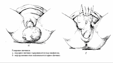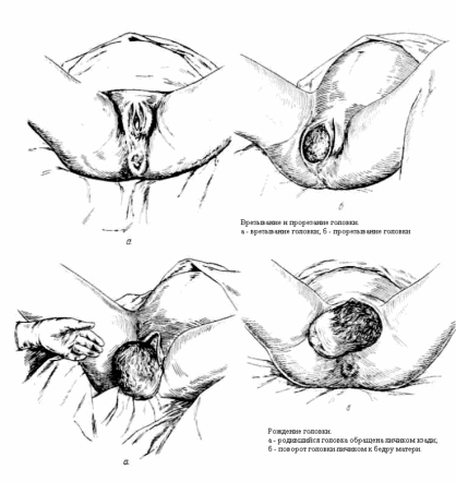 Под влиянием одновременно действующих изгоняющих схваток и потуг головка опускается в малый таз, проходит через его полость к выходу.