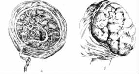 В конце беременности и к моменту родов диаметр плаценты достигает 15-18 см, толщина 2 - 3 см, масса 500-600 г. Плацента имеет две поверхности материнскую прилегающую к стенке матки, и плодовую, обращенную внутрь в полость амниона. Плодовая поверхность покрыта гладкой, блестящей водной оболочкой, под которой проходят к хориону сосуды, идущие в радиальном направлении от места прикрепления пуповины к периферии плаценты.