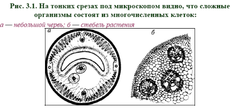 На рис. 3.1 в увеличении показаны два поперечных среза – срез небольшого червя и стебля растения. Легко заметить, что обе структуры состоят из маленьких «кирпичиков» – клеток, плотно прижатых друг к другу. В одном и том же организме бывают разные клетки, которые образуют разные виды тканей, такие как эпидермис (кожа или поверхностный слой), мышцы животных или древесина растений. Каждая ткань состоит из особого типа клеток, но для всех клеток характерно наличие оболочки, придающей им форму, и ядра – округлого образования, обычно располагающегося в центре клетки (или у одной из сторон во многих растительных клетках). От окружающей среды содержимое клетки отделено очень тонкой мембраной, которая удерживает вместе ее компоненты и через которую поступают или выделяются различные химические вещества.