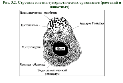 Остановимся пока на строении клеток эукариот. Современные микроскопы, особенно электронные, помогли установить, что в большинстве клеток содержатся различные внутренние структуры, которые называются органеллами (рис. 3.2). Самой заметной органеллой часто бывает ядро – центральная структура, ограниченная мембраной. Ядро особенно важно для генетики, так как в нем имеются хромосомы, содержащие наследственный материал. В клетке есть также многочисленные вытянутые тельца, которые называются митохондрии; они получают энергию из молекул пищи, таких как сахар (глюкоза), и накапливают их в химической форме, после чего клетка уже может использовать эту энергию.