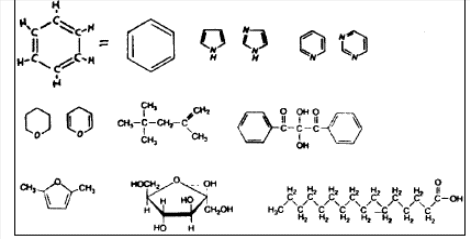 Каждая линия между атомами соответствует связи, то есть общей паре электронов. Двойные и тройные линии обозначают двойные и тройные связи между атомами. Более сложные молекулы, особенно те, что имеют кольцевые структуры, обычно изображаются в виде линий, в местах соединения которых атомы углерода (часто с одним или двумя атомами водорода) не обозначаются. Поскольку валентность углерода равна четырем, каждый атом углерода должен иметь четыре связи; если показаны только три связи атома углерода, то с этим атомом должен быть связан еще один атом водорода (кислород, связанный с водородом), присоединенная к углеродной цепи, образует спирт (алкоголь).