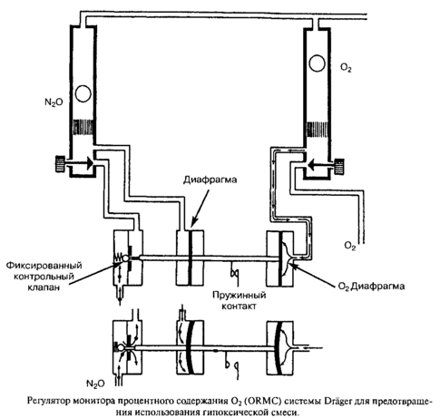 дистальнее игольчатого клапана обеспечивал не только сравнение давлений, но и сравнение потоков. Процесс сравнения был усовершенствован при помощи соединения двух диафрагм стержнем. К стержню была прикреплена пластина электрического контакта. При движении стержня электрический контакт мог замыкаться и, таким образом, активизировать тревожную сигнализацию. Поскольку при добавлении третьего газа точная работа тревожной сигнализации нарушалась, разработчики решили просто сделать недоступной функцию тревоги при допущении третьего газа. В механизме ORMC применен дополнительный «подчиненный» клапан, связанный с потоком N20. Он ограничивает расход этого газа по принципу обратной связи, делая невозможным поступление газовой смеси, более чем на 75% состоящей из N20. Это ограничение работает вне зависимости от того, доступна или нет звуковая тревога согласно положению переключателя: N20/02 — все газы.