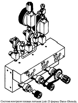Аппараты Datex-Ohmeda контролируют соотношение потоков 02 и N20 механически. Во-первых, давления двух газов строго приводятся вторыми последовательными редукторами к уровню 1 атм. и 1,7 атм. Во-вторых, две шестерни — 02, имеющей 29 зубцов, и N20, имеющей 14 зубцов, соединены ремнем. Шестерня 02 приводится в движение ремнем только при попытке увеличить долю потока N20 свыше 75%. При такой попытке поворот ручки N20 вызовет поворот ручки 02 с отношением оборотов 14:29. Подобным образом, попытка снижения подачи 02 приведет к сокращению подачи N20. Отношения давлений и оборотов шестерен компенсируют влияние различий плотностей и вязкостей двух газов на их потоки.