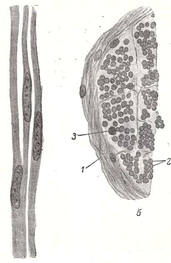 1- соединительная ткань, 2- безмякотные нервные волокна, 3- ядро шванновской клетки.