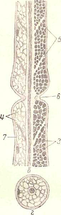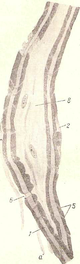 1 – осевой цилиндр, 2 – шванновская клетка, 3 – миэлин в цитоплазме шванновской клетки после удаления миэлина, 5 – насечки, 6 – перехваты, 7 – неврилемма, 8 – соединительная ткань.