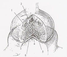 Рис.8. Синапс (схема): 1-визикулы; 2-митохондрии; 3-пресинаптическая мембрана; 4-синаптическая щель; 5-ионный канал; 6-постсинаптическая мембрана.